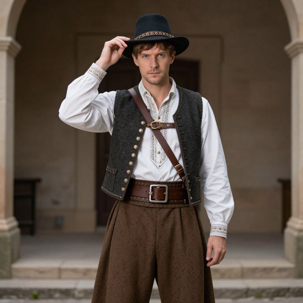 Photograph of a young Caucasian man with light brown hair and blue eyes, standing in front of an arched stone doorway. He wears a black, textured wool vest over a white, long-sleeved shirt with lace details, brown high-waisted trousers, and a dark brown leather belt. His black felt hat, adorned with a decorative band, is tilted slightly as he touches it with his right hand. The background features a stone wall and a dark wooden door. The man's expression is serious and he stands confidently, exuding a rustic, historical vibe. The lighting is natural, highlighting the textures of his clothing.
