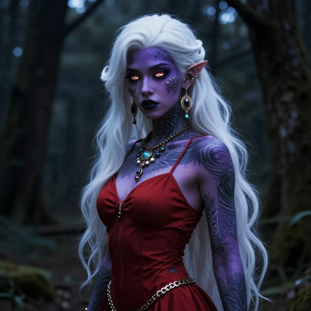 Digital artwork of a dark purple-skinned, elf-like woman with long white hair, wearing a red dress, adorned with tattoos, in a forest.
