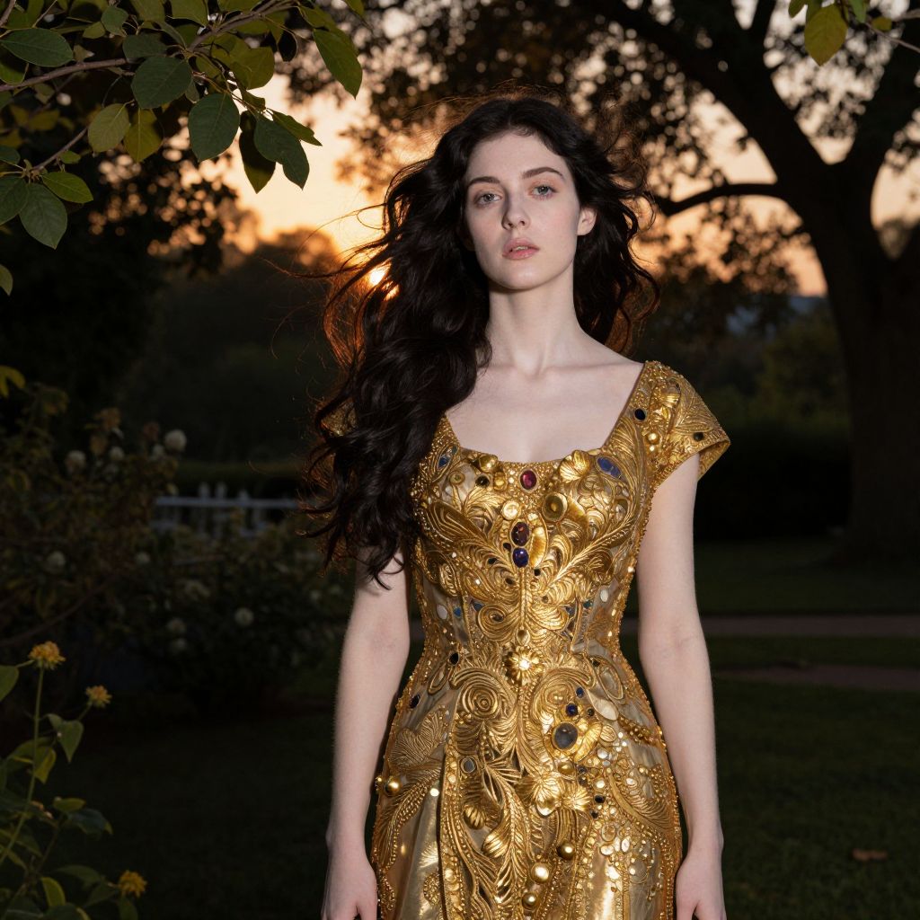 Photograph of a pale-skinned woman with long, wavy dark brown hair standing in a dimly lit garden at sunset. She wears a gold, sequined dress with intricate, swirling patterns that shimmer in the light. Her expression is neutral, and she gazes directly at the camera. The background features dark silhouettes of trees and foliage, with the sun setting in the distance, casting a warm orange glow. Leaves frame the top left corner of the image, adding to the natural setting. The overall mood is elegant and slightly mysterious.