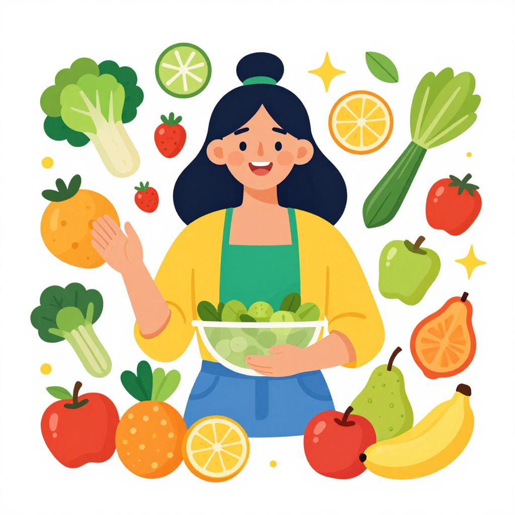Cartoon woman with black hair, yellow cardigan, green apron, holding bowl of greens, surrounded by colorful fruits and vegetables.