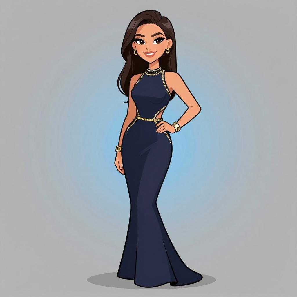 Woman with pretty face and pretty hair. smiling Woman, elegant evening wear, floor-length gown in classic black, deep V-neckline, sleeveless, fitted silhouette, mermaid skirt, embellished waistband with crystals, strappy chest detail, solid color, gray studio background --sref 1467