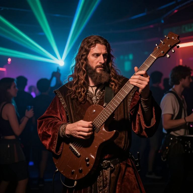 Chocolate a bard from the middle ages playing music in an industrial rave party with lazers in front of peopl, realistic,