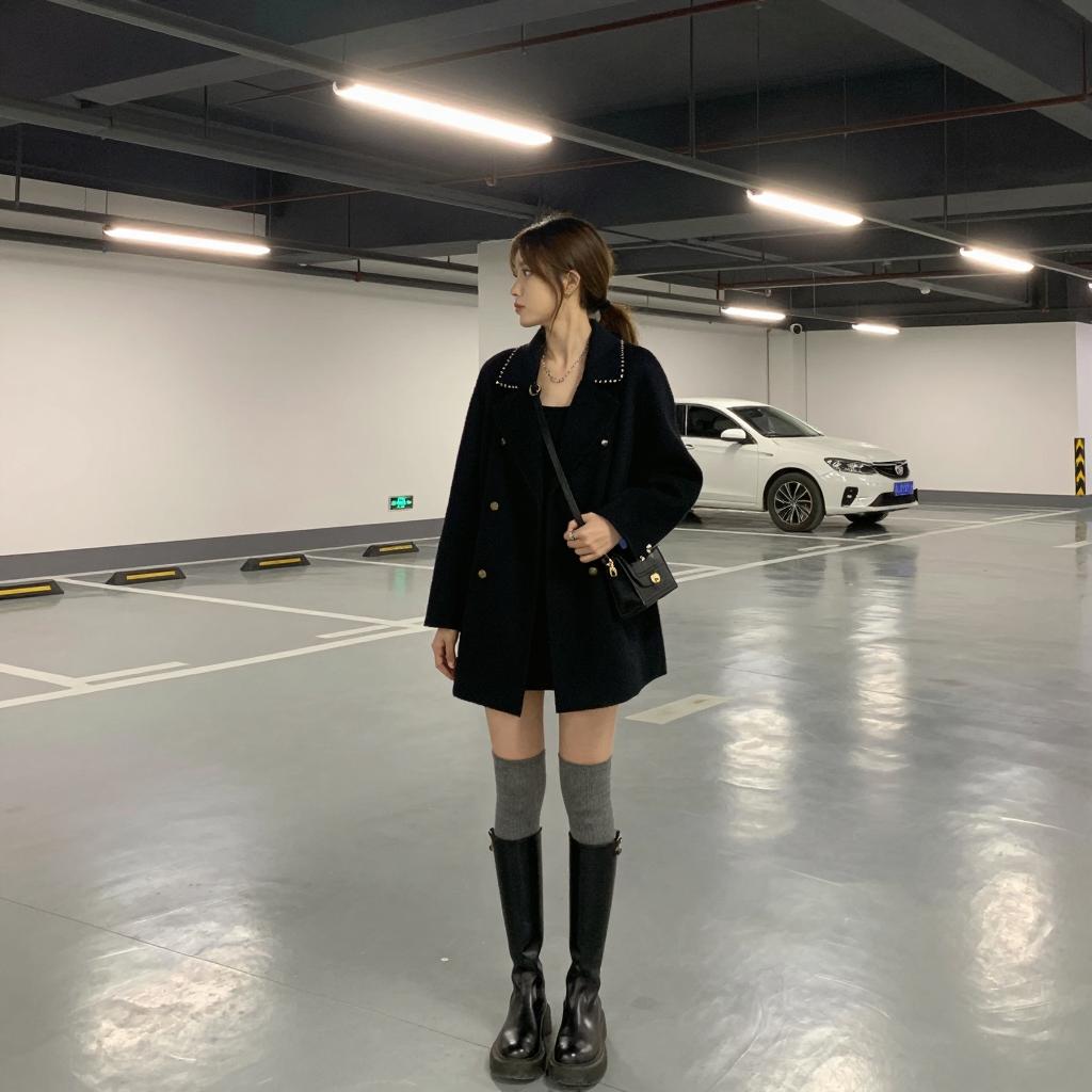 Woman in a modern, empty parking garage. Standing in profile. Black coat with white trim, black dress, knee-high gray socks, black boots. Brown hair in a low ponytail. Holding a small black crossbody bag. White car in the background. Overhead fluorescent lights. Concrete floor and white walls. Arms at sides, hands on hips. Full body shot.