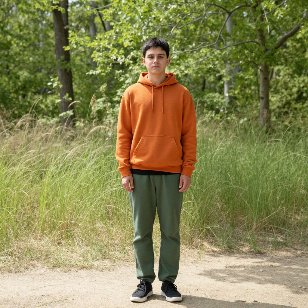 A young adult male stands on a soft dirt ground, surrounded by tall grass and lush trees in the background, creating a natural, outdoor atmosphere. He is wearing an orange hooded sweatshirt with a black belt and green pants, the hood slightly pulled back to reveal his face. The scene is sunlit with gentle shadows, emphasizing the warm tones of the clothing and the vibrant greenery around him. The composition is simple and grounded, capturing a moment of quiet presence in a peaceful forest-like environment.