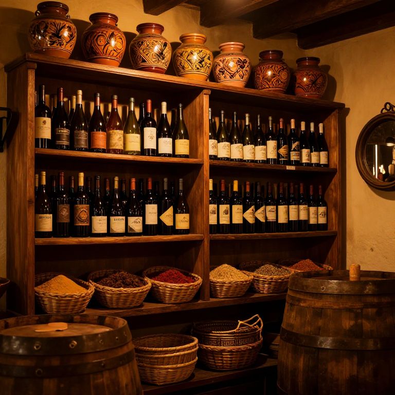 Bodeguita interior scene with vintage wooden shelves filled with artisanal wines, hand-painted ceramic jars, woven baskets of spices, old-fashioned barrels, warm ambient lighting casting soft shadows, cozy and nostalgic mood, rich warm colors, intricate rustic details