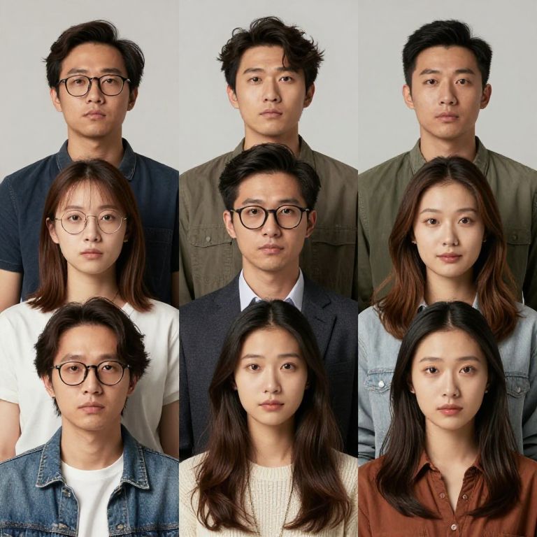 A diverse group of individuals posed for portraits in a studio with soft lighting, each showing unique facial expressions and clothing styles