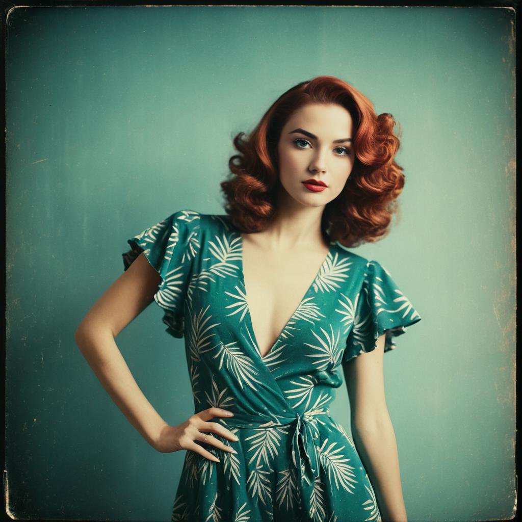 Portrait of a young woman with vintage hairstyle and bold makeup, wearing a deep V-neck green romper with a white palm leaf print. The romper features short flutter sleeves and a cinched waist. She has an elegant updo with a hair accessory and poses confidently against a solid teal background.