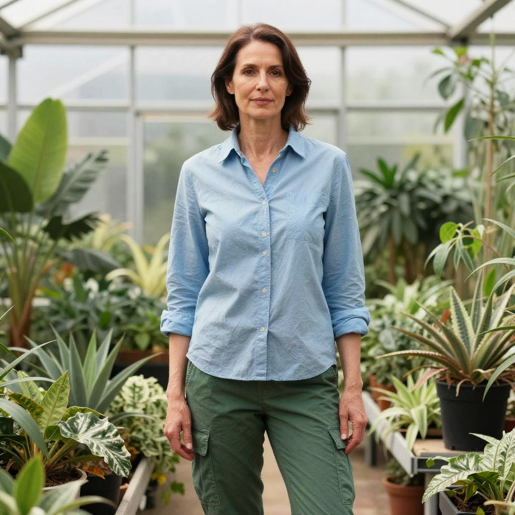 Photograph of a woman with long dark hair, wearing a cream knit sweater and distressed blue jeans, standing in a sunlit room with a wooden table