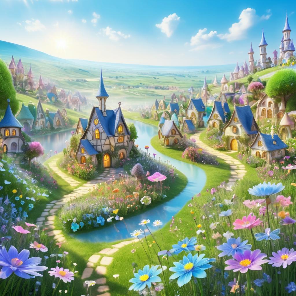 Fantasy landscape of a mystical fairy city in a flower meadow, with delicate cottages, blooming flora, and an aerial view of the expansive city.