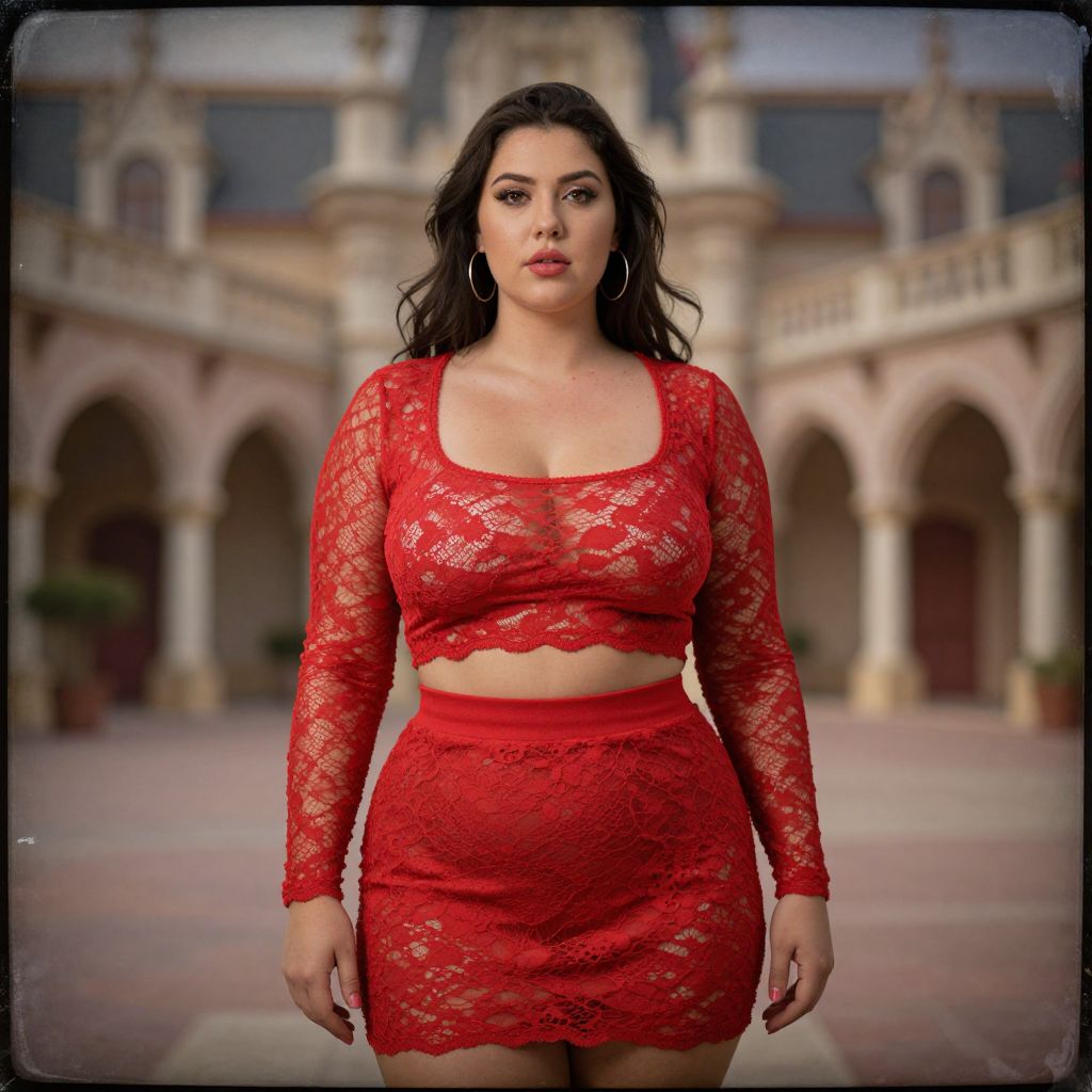 A plus-size woman, Collodion wet plate style, in a bold, red lace print two-piece set with a square neckline, long sleeves, cropped top with midriff cut-out, and matching high-waisted mini skirt, hoop earrings, minimal makeup, standing in an enchanting castle courtyard, admiring the ancient architecture. Sexy. Pretty face and beаutiful eyes. Big breasts