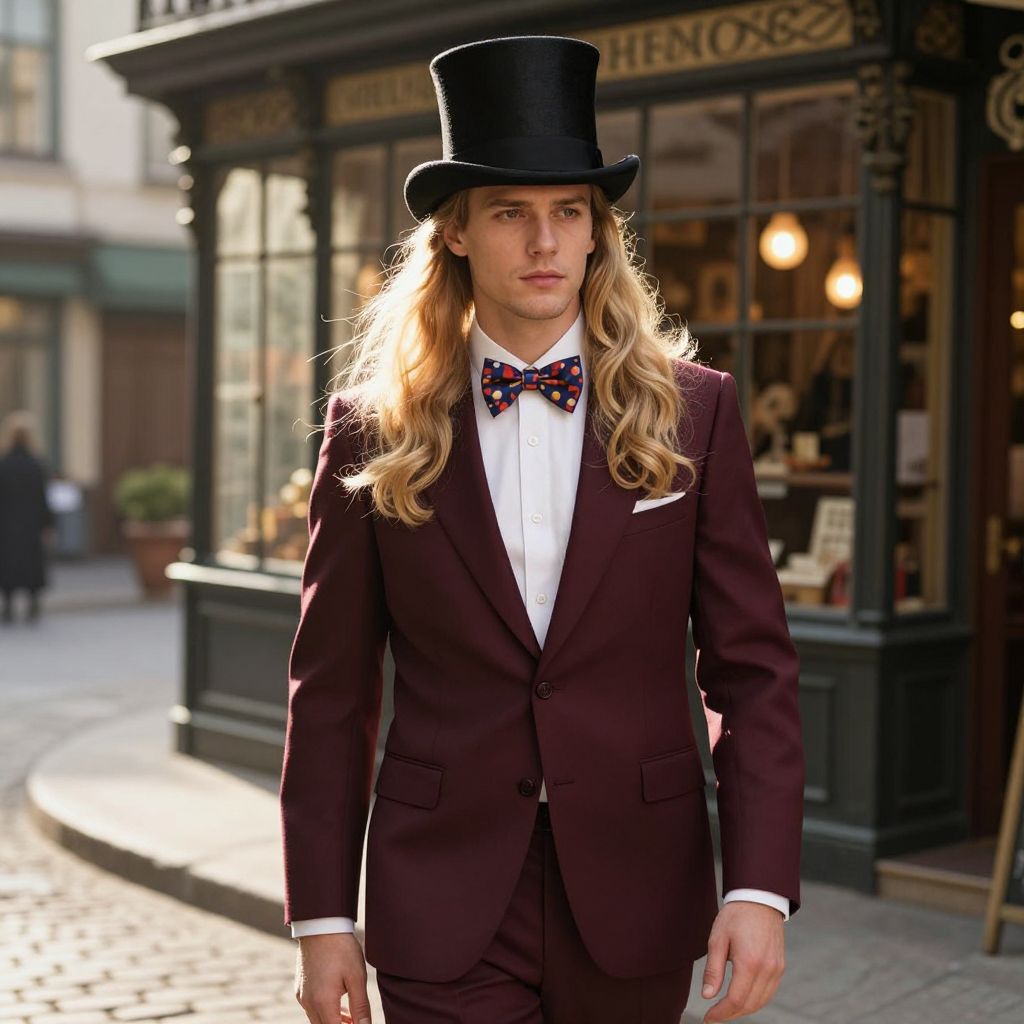 A stylish man with long, flowing blonde hair that cascades down his shoulders, styled with a touch of sophistication and elegance, wears a distinguished top hat perched neatly on his head, adding a touch of classic flair. He is dressed in a sophisticated maroon suit with tailored lines and rich fabric, paired with a crisp white shirt and a vibrant, eye-catching patterned bow tie that adds a modern twist to the vintage aesthetic. His expression is calm, confident, and timeless, exuding quiet charm and refined charisma. The scene is set in a classic, vintage-inspired environment—perhaps a grand 1920s street corner, a sun-dappled cobblestone alley, or a vintage bookstore with ornate details—where golden hour light filters through antique windows, casting soft shadows and enhancing the nostalgic atmosphere. The overall mood is elegant, romantic, and deeply rooted in timeless style.