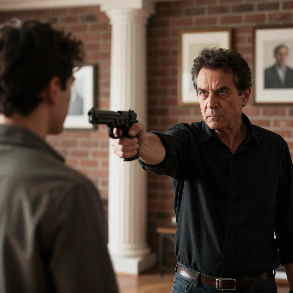 Middle-aged man with dark hair, wearing a black jacket, pointing a handgun at a framed picture on a brown wall. Door frame and green curtain in background. Framed picture has a forest scene. Man's expression is intense.