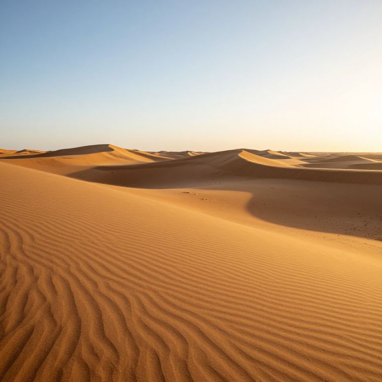Photograph of a sunlit desert with rippled sand dunes under a clear, bright blue sky at sunset, casting warm golden hues.