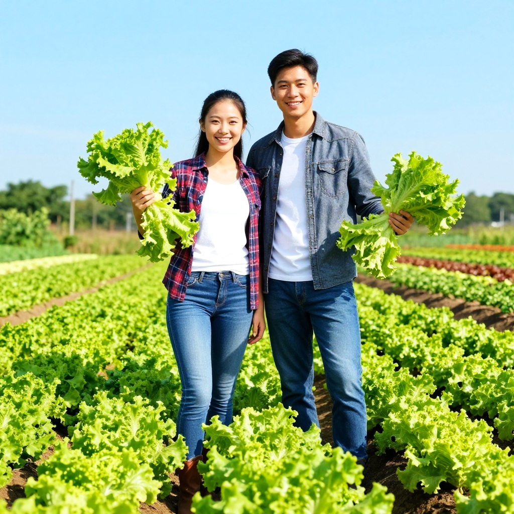 Photograph of smiling Asian couple holding fresh leafy greens in a vibrant, sunlit vegetable field under a clear blue sky.
