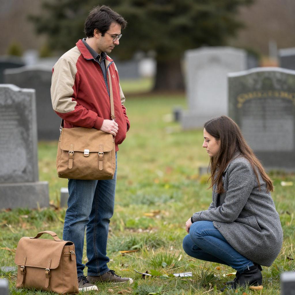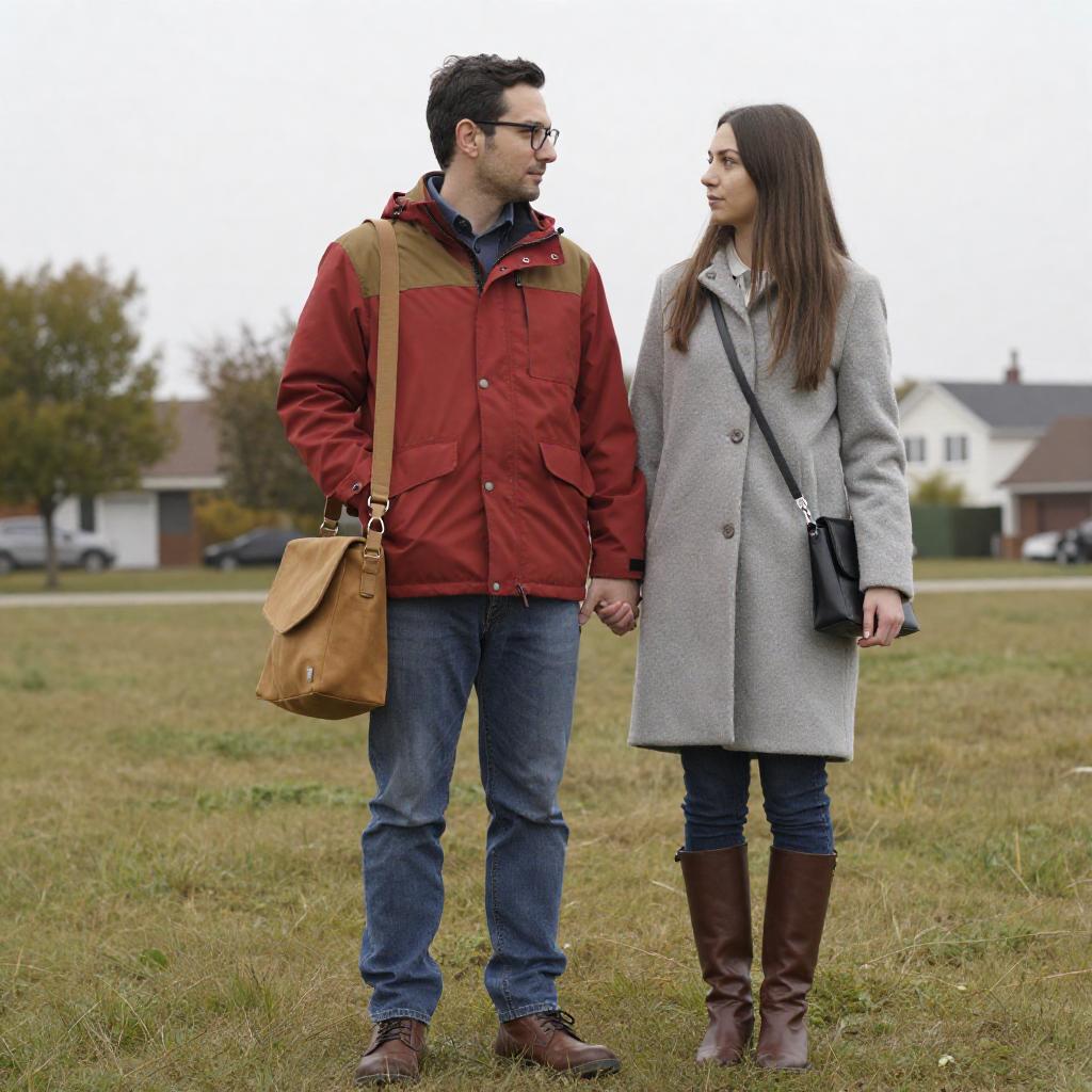 Photograph of a couple standing on grassy ground in a suburban area with trees and houses in the background. The man wears a red and brown jacket, blue jeans, brown boots, glasses, and carries a tan shoulder bag. The woman wears a gray coat, blue jeans, brown boots, and carries a black crossbody bag. Both have neutral expressions and are looking at each other, dressed in casual autumn attire.