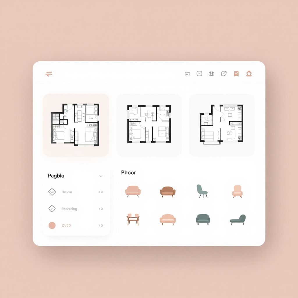 Floor plan generator interface with user-friendly digital dashboard, minimalist style, showing different room layouts and customizable furniture options, soft pastel colors, modern flat design, clean lines, subtle shadows, high resolution render