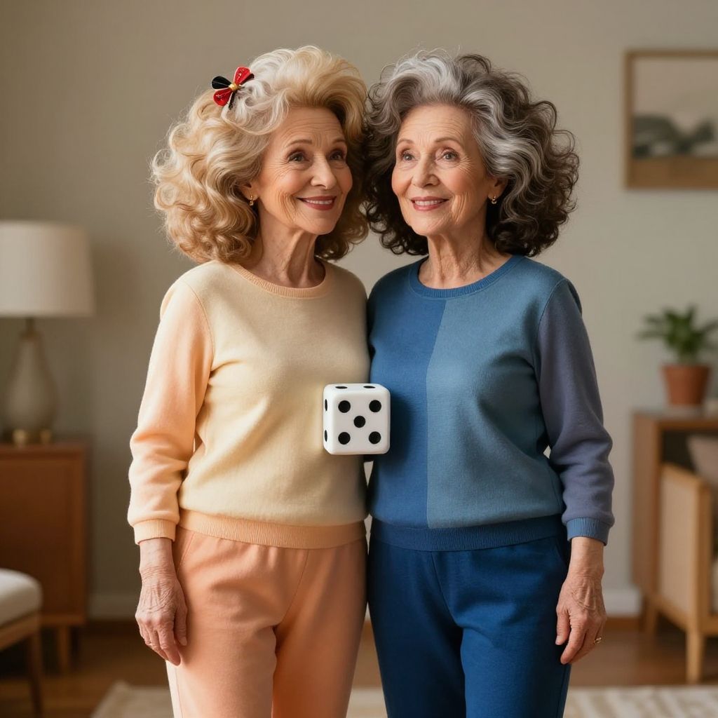 Photograph of two elderly women standing side by side in a warmly lit living room. The woman on the left has curly blonde hair adorned with a red bow, wearing a cream-colored sweater and peach pants. The woman on the right has curly gray hair, wearing a blue sweater and matching pants. A white dice with black dots is superimposed on the chest of the woman in blue. The background includes a wooden side table with a lamp, a potted plant, and a framed picture on a beige wall. Both women smile warmly at the camera.