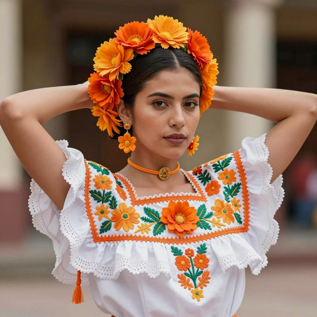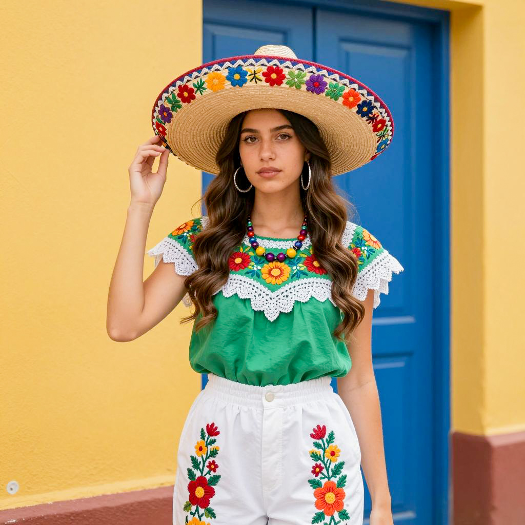 Young woman with long wavy brown hair, wearing a colorful embroidered sombrero, green and white lace-trimmed top, and white pants with floral embroidery. She stands against a yellow wall with a blue door in the background. Her expression is neutral. She has large hoop earrings and a colorful necklace. The clothing has intricate patterns and ures. She stands with her right arm slightly raised.