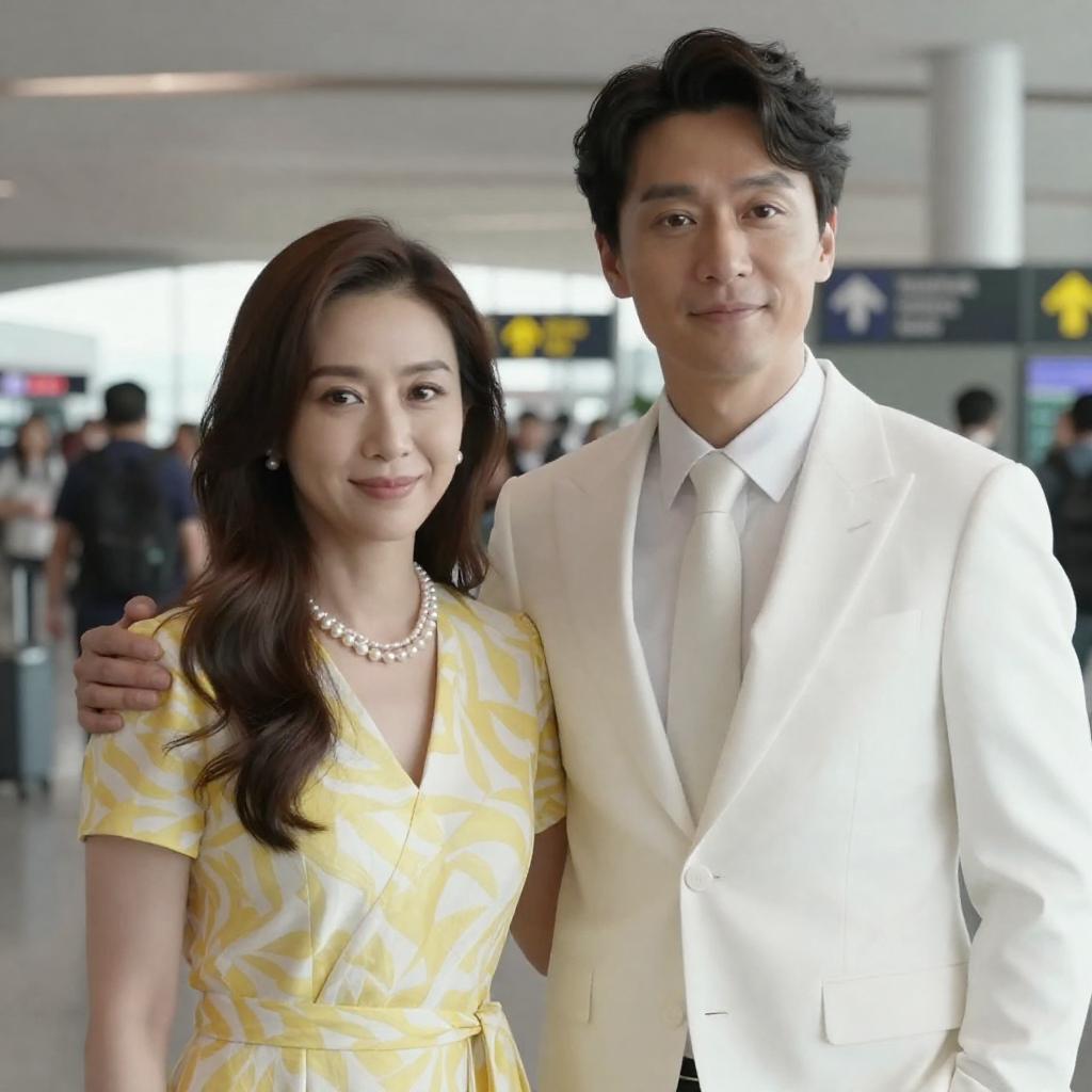 Photograph of two people and a man in the car. Woman with long brown hair, floral dress, left of open car door. Man with dark hair, white suit, right of car door, waving hand. Man in car, short hair, holding camera. Background: hills, daytime.