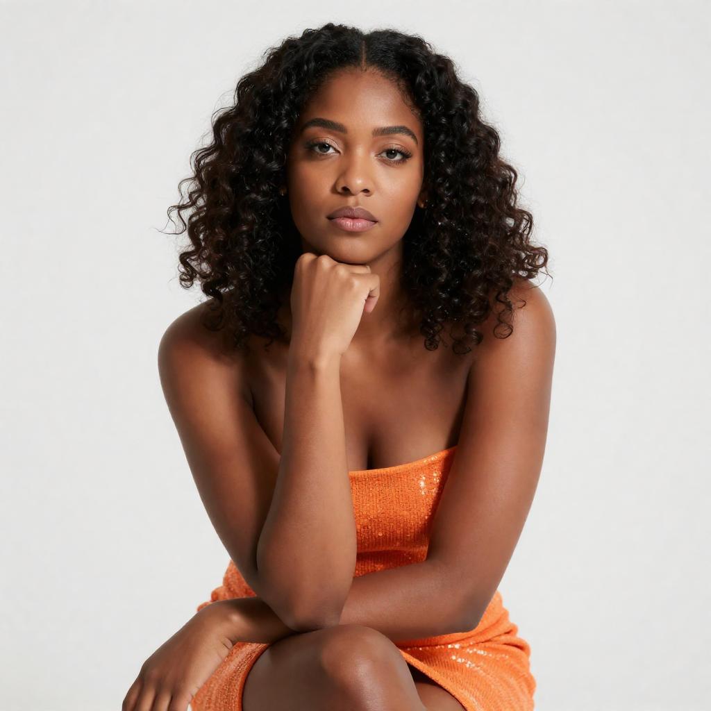 Photograph of a woman with long, curly black hair and dark skin, illuminated by warm, dramatic lighting. She wears a dark, sequined top with a deep neckline, smiling slightly. The background is dark, enhancing the contrast and highlighting her features. The image has a rich, moody atmosphere.