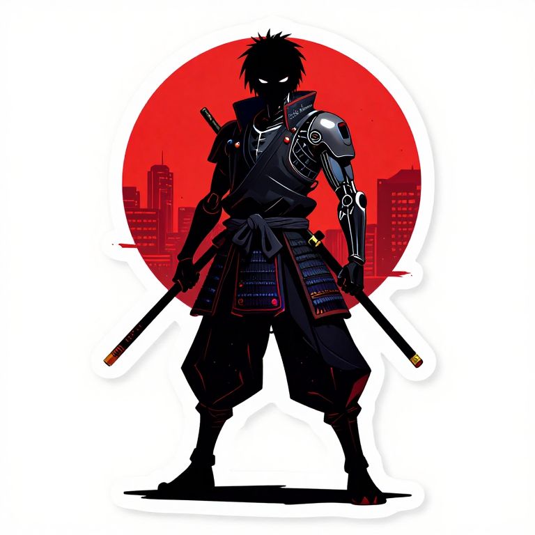 Cyberpunk, anime, Cyber Punk Tradicional cyborg Samurai on a standing warrior pose with a red sun and city behind, highly detailed Mayhem style splattered Silhouette a3 print amazing street art oitsi, 8k full body full image sticker white background one colour bizarre ghetto transmission Charles Schulz style minimalist, conceptual art posing Japanese, conceptual, 3d render, illustration, cinematic, photo epic action, Unreal Engine, cinematic award winning artwork, many details, full of details, Wide range of colors, dramatic, Dynamic, Cinematic, Sharp details, Insane quality, Insane resolution, 32k resolution, casting shadow style, cucoloris patterned illumination, dvr-lnds-sdxl, ral-dissolve, ral-ertmsphr, ral-porcelain, ral-pxlprtcl, Niji, aidma-niji