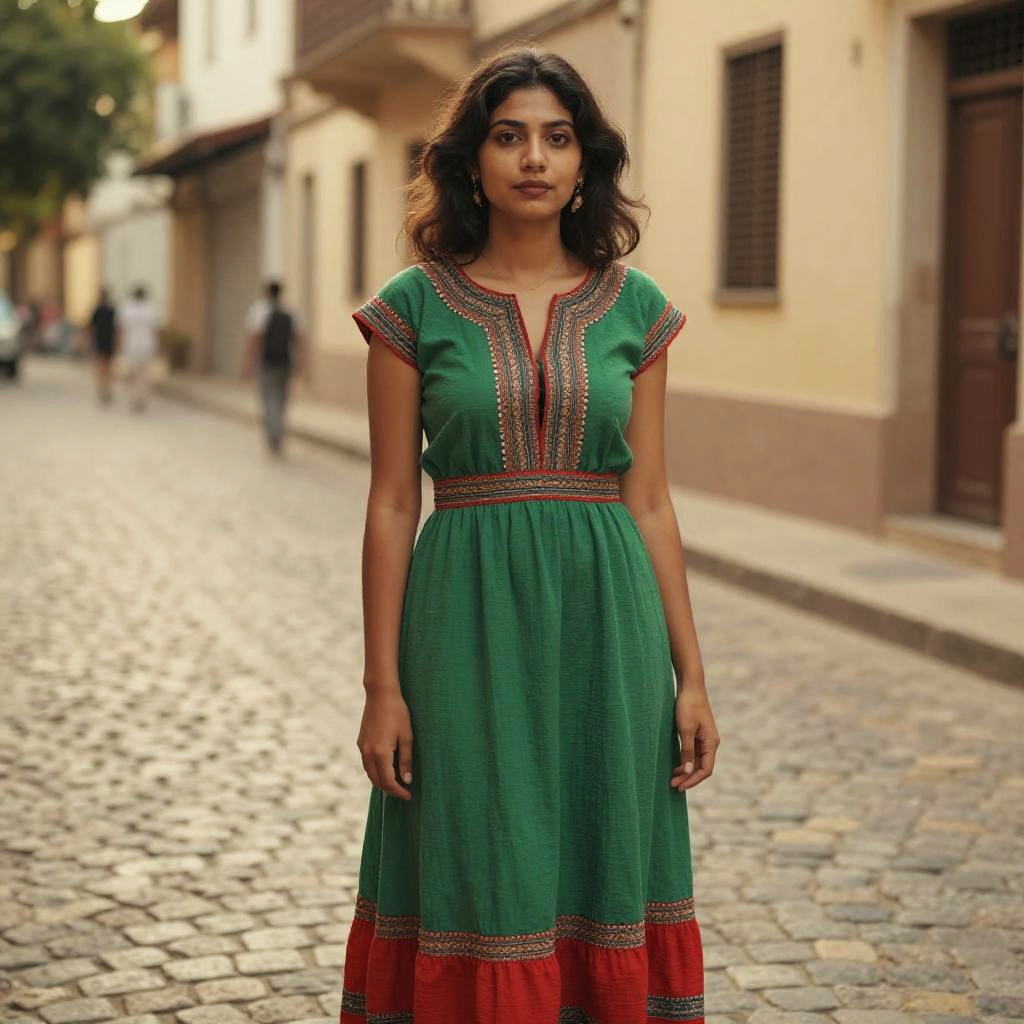 Ethnic Photoshoot, a woman in a green and red dress standing on a cobblestone street
