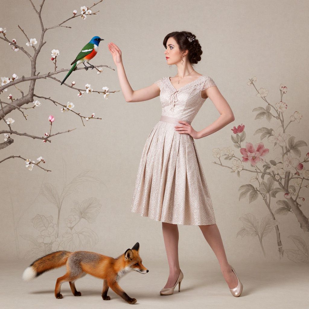 Elegant woman in vintage attire stands gracefully against a floral backdrop, her hand raised as a playful fox scampers below and a vibrant bird perches above amidst blooming branches.