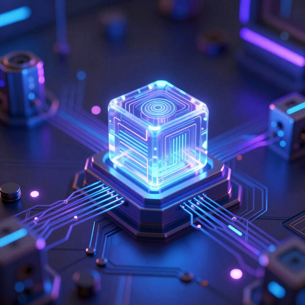 Stable video AI algorithm depicted as a glowing core powering smooth, dynamic video frames flowing through digital circuits in a cybernetic environment, blue and purple neon lighting, sleek design.