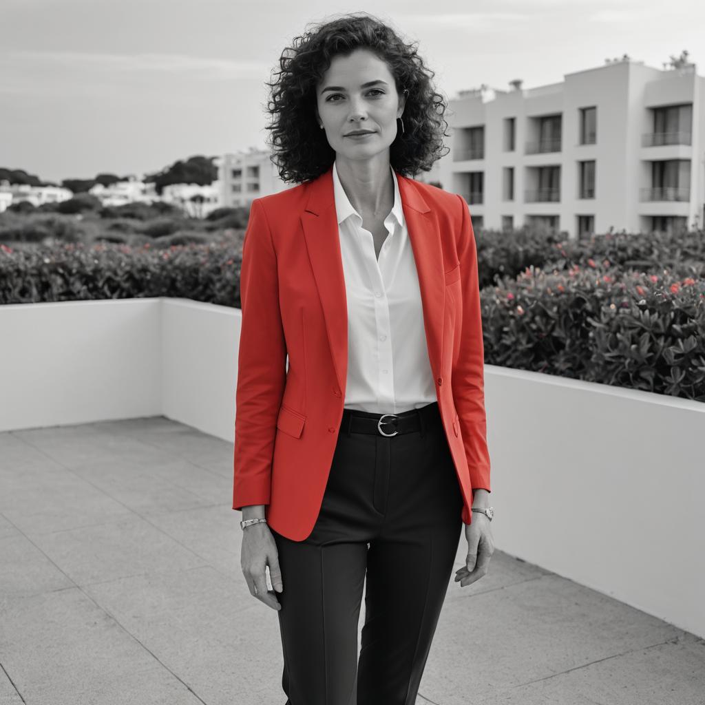 Portrait of a woman with narrow shoulders and curly hair standing on a seaside terrace. She wears a tailored azalea red blazer and matching red pants paired with a white cotton t-shirt. The background shows modern white buildings and coastal greenery under a cloudy sky. The image uses selective color highlighting the red outfit against a black and white background, emphasizing minimalist and modern style.