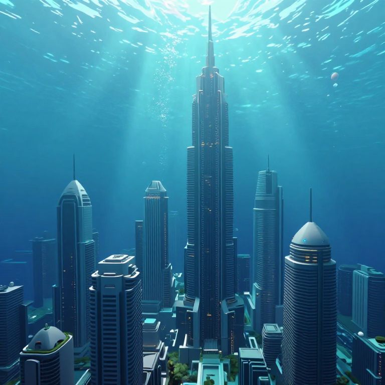 Digital artwork of a futuristic underwater cityscape with tall, reflective skyscrapers bathed in blue light and sunlight beams.