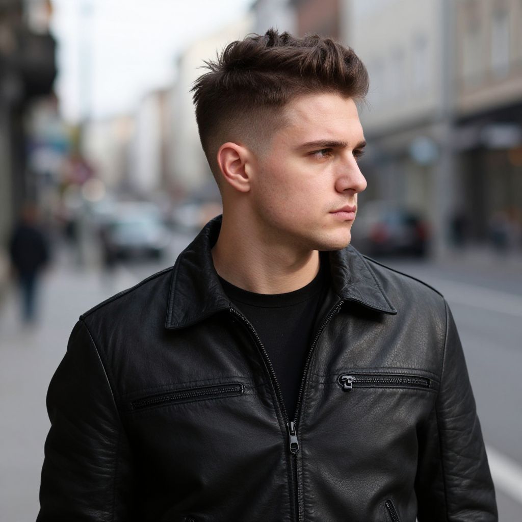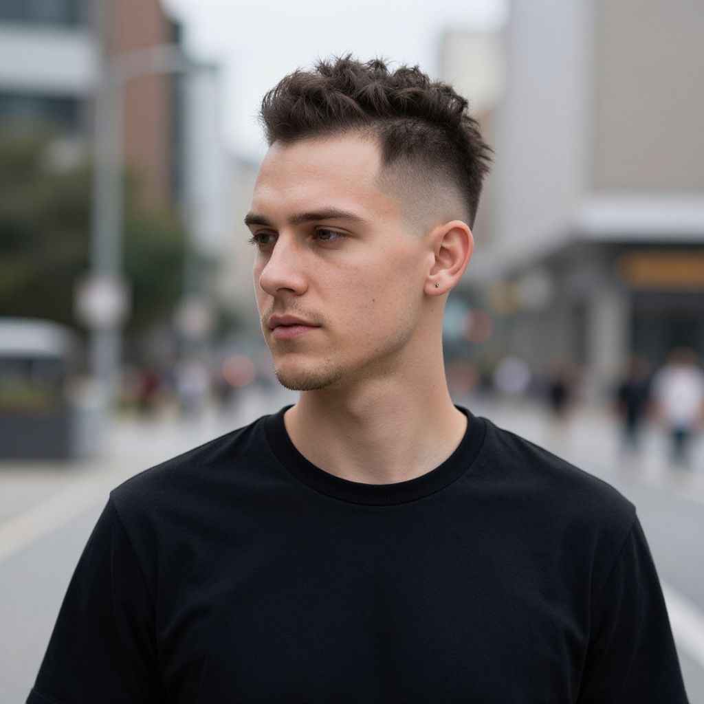 Classic Mohawk, fit european man, realistic lifestyle photography, urban environment, sharp facial details, natural light, high dynamic range, professional grooming, modern fashion sense, detailed hair styling, 8k resolution, 32:9 aspect ratio