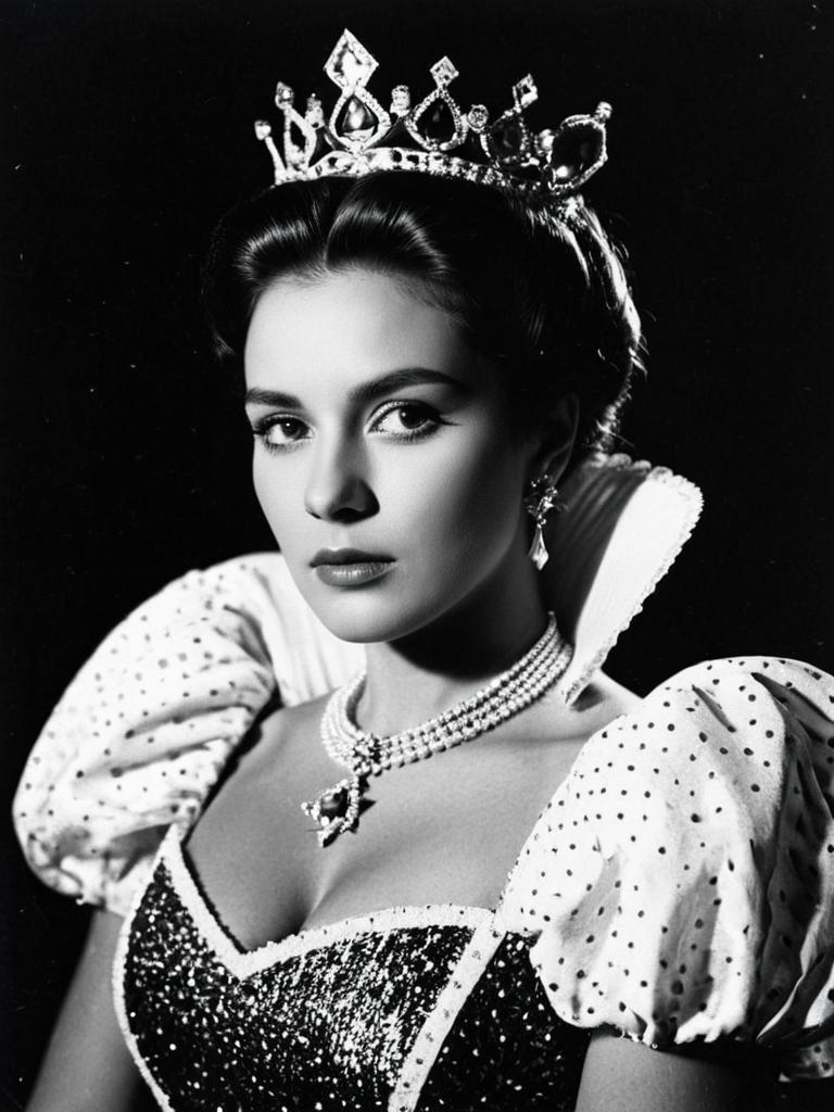 Studio portrait of a woman wearing a detailed blue princess costume with puffed sleeves and silver embellishments. She is adorned with a jeweled crown, matching pearl necklace with a large gemstone pendant, and dangling earrings. The background is dark, highlighting her elegant and regal appearance.