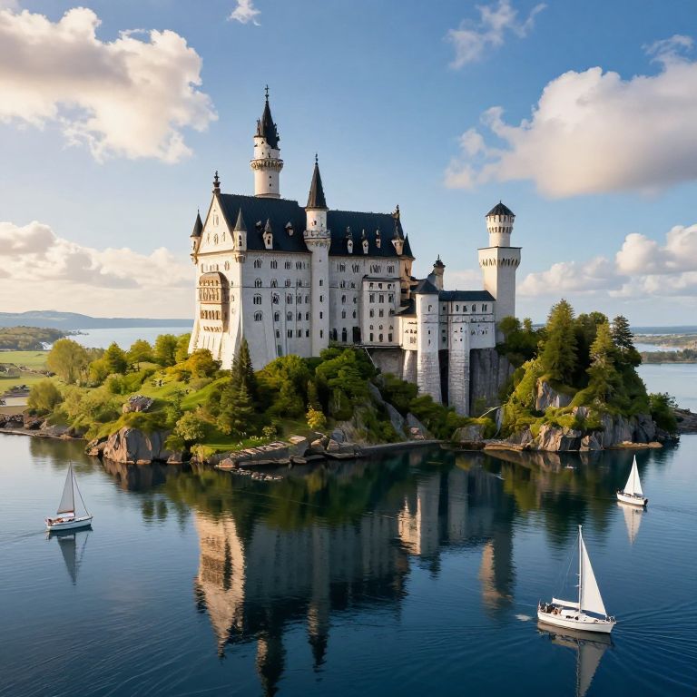 Photograph of a majestic, white, castle-like structure with multiple black-topped towers and turrets, situated on a small, lush green island surrounded by calm, reflective blue water. Two white sailboats with triangular sails are in the foreground, one to the left and one to the right. The sky above is bright blue with scattered white clouds. The castle's reflection is clearly visible in the water. The castle's architecture features numerous windows and a steep, dark roof. Green trees and rocky outcrops are scattered around the island. The overall scene is serene and picturesque.