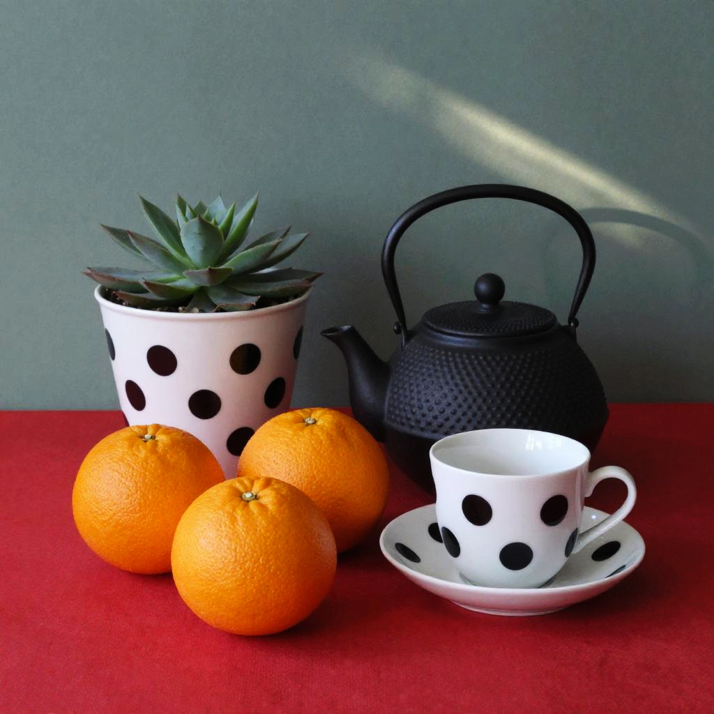 Photograph of a minimalist still life setup. On a white table, there's a cream-colored vase with white flowers and green foliage, a matching cream teapot, a glass with amber liquid, a small basket, three oranges, a bunch of red grapes, and another orange. The background is a plain, light gray wall. The colors are soft and natural, creating a serene, elegant atmosphere.