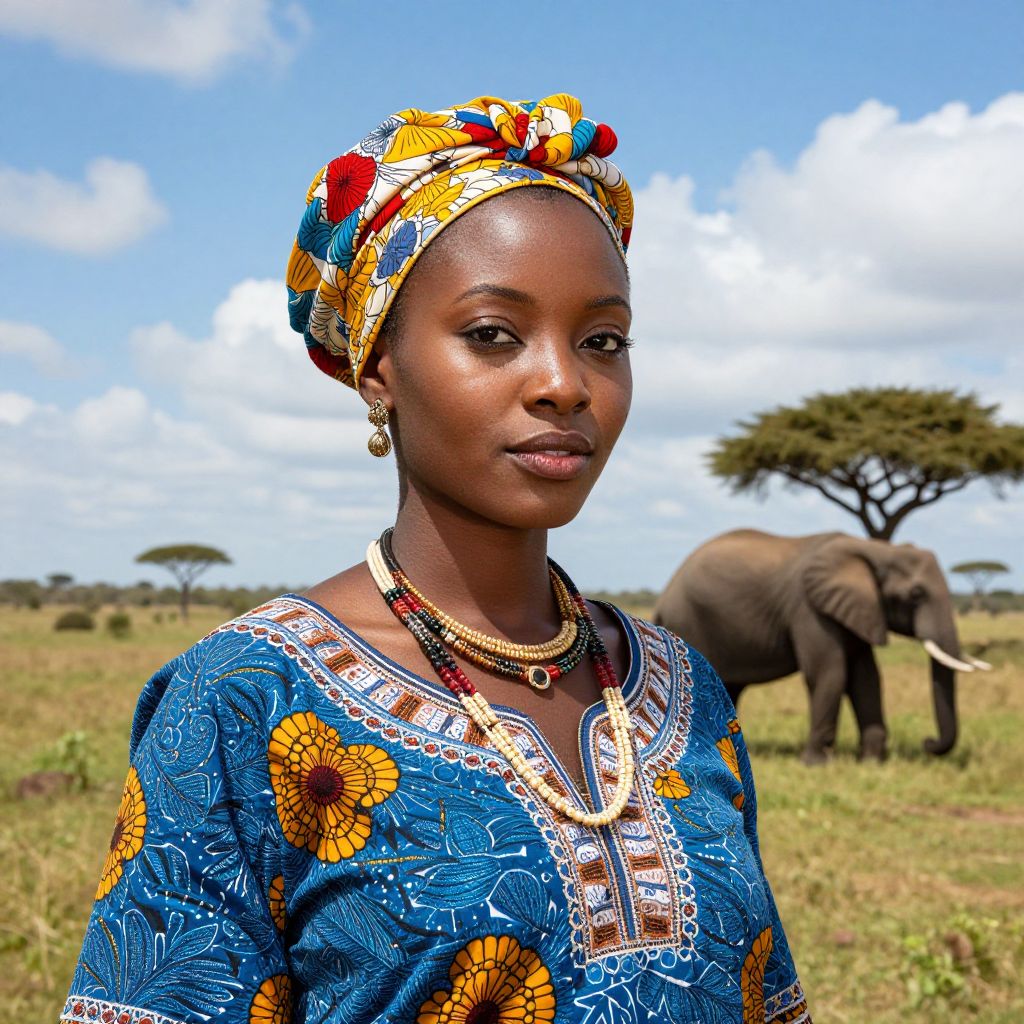 Vibrant portrait of a woman adorned in traditional African attire, featuring a floral headscarf and necklace, set against a serene savanna landscape with a majestic elephant grazing peacefully in the background under a vast, cloud-dotted sky.