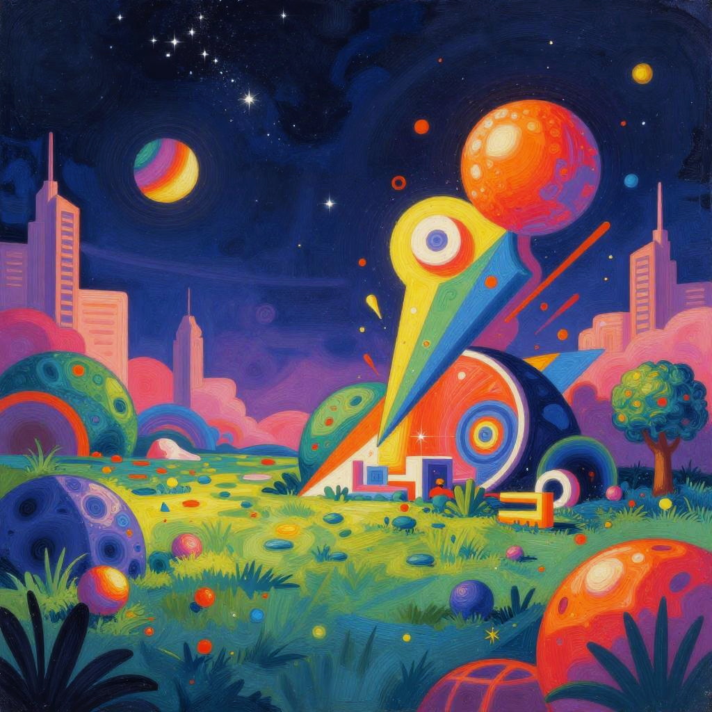 Vibrant, psychedelic digital artwork of a surreal landscape with swirling, colorful patterns, glowing flowers, winding path, and towering, abstract structures under a