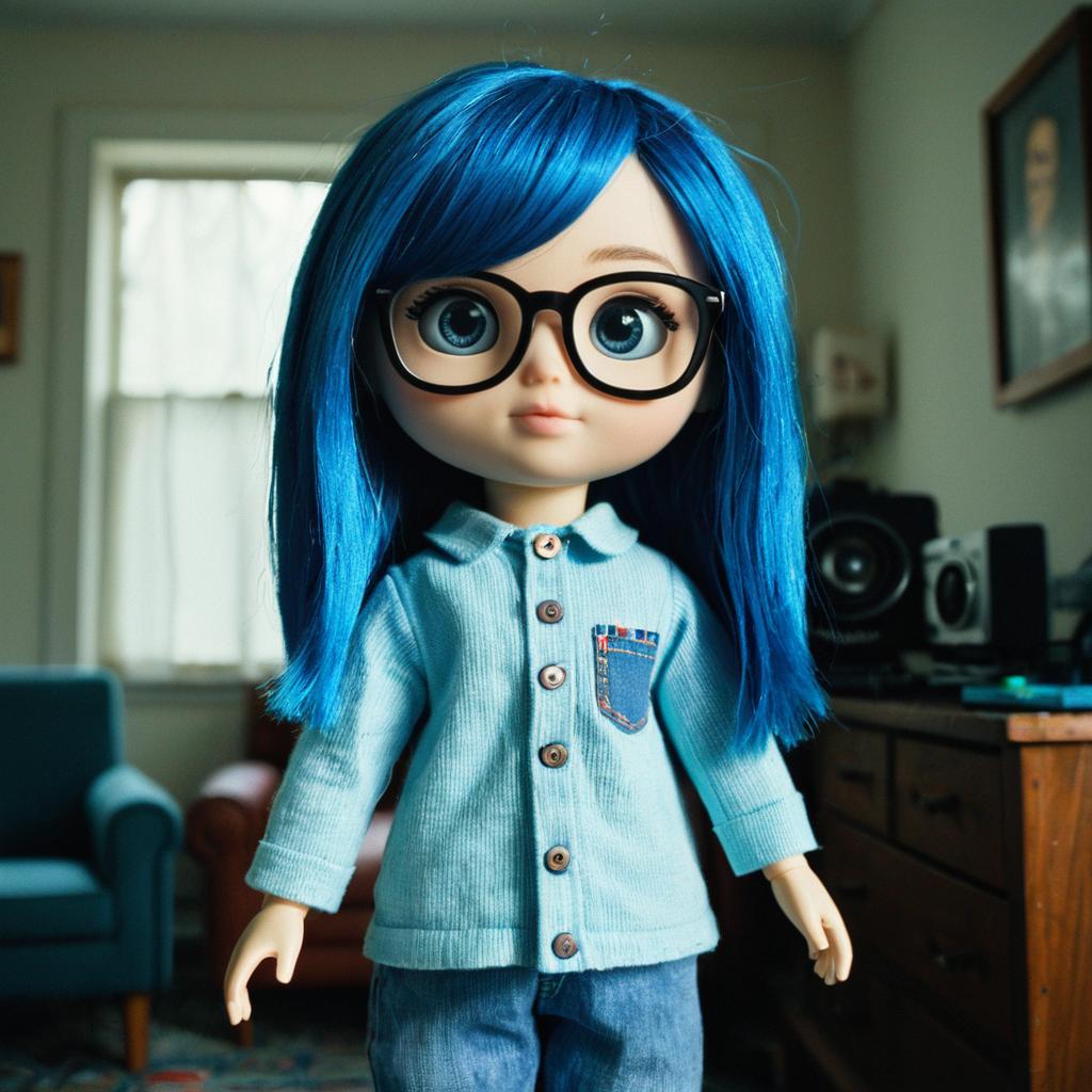 Photograph of a blue-haired doll with large black glasses, wearing a light blue button-up shirt and blue jeans, standing in a dimly lit living