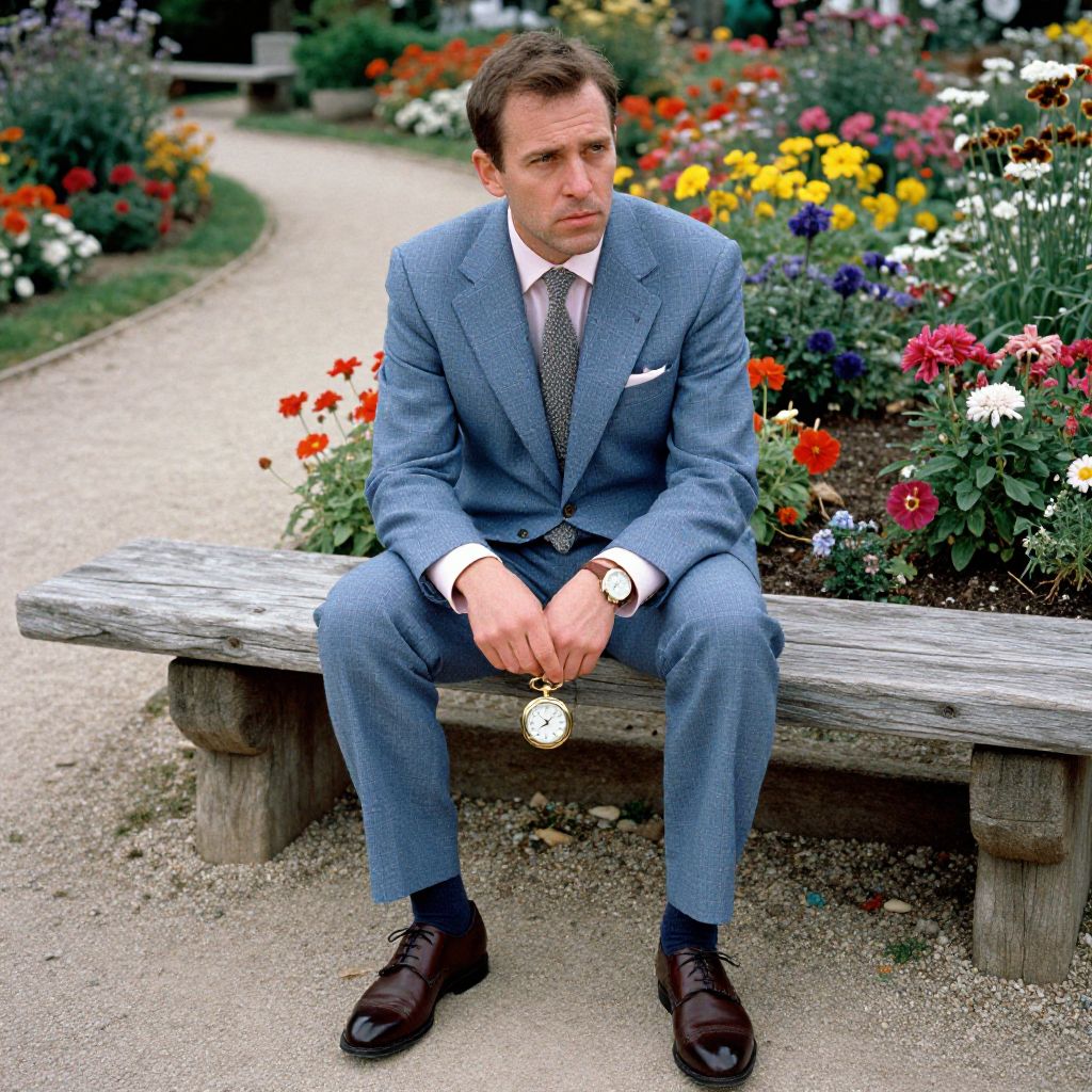Photograph of a Caucasian man with short brown hair, sitting on a wooden bench in a vibrant garden. He wears a light blue, checkered suit, white dress shirt, gray tie, black shoes, and a silver wristwatch. He holds a pocket watch in his right hand. The background features a gravel path winding through colorful flowerbeds with red, yellow, purple, and white flowers. The man looks slightly to the right with a serious expression. The image has a bright, colorful, and slightly saturated style, emphasizing the garden's vividness and the man's formal attire.
