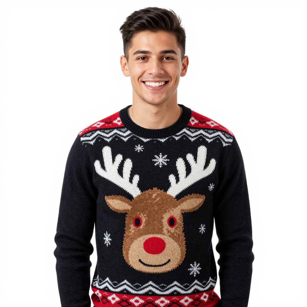 This is a color photograph of a smiling young man with short dark hair and light skin. He's wearing a black Christmas sweater with a large, cute reindeer face on the front, complete with white antlers, a red nose, and red eyes. The sweater also has red and white patterns on the shoulders and hem. The background is plain white, making him and the sweater stand out. He looks friendly and approachable.