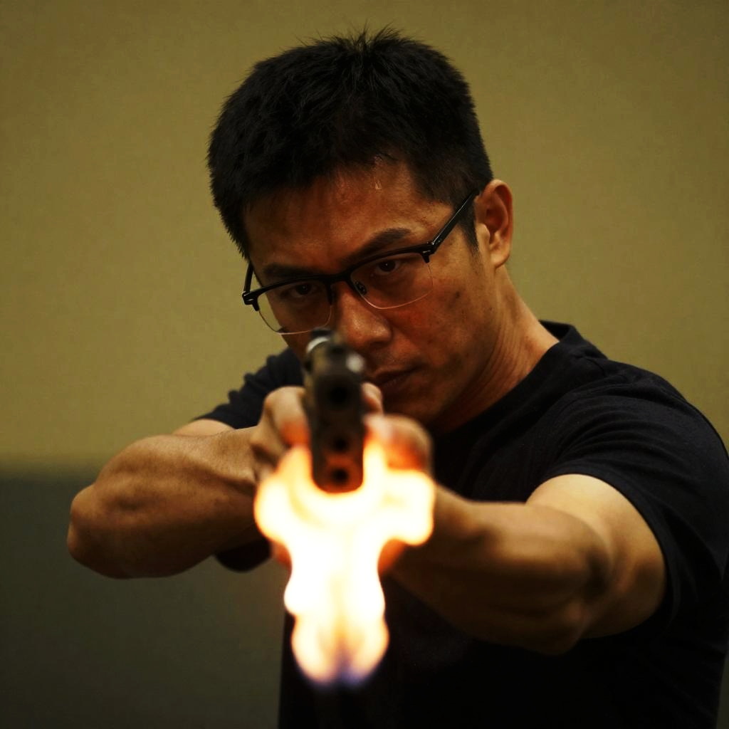 Photograph of a man with short black hair, wearing glasses and a dark shirt, aiming a gun with a bright, orange flame at the muzzle. His hands grip the gun firmly. The background is dimly lit with a yellow-green glow. The flame is centered in the foreground, casting light on the man's face.