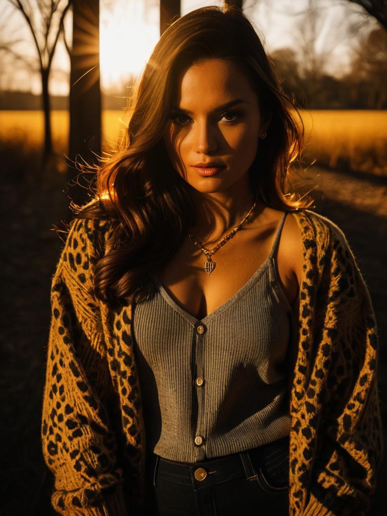 Woman, casual streetwear, oversized cardigan with leopard print, black and brown, v-neck, long sleeve, distressed denim mini skirt, layered tops with a grey camisole over a brown striped long sleeve t-shirt, delicate silver necklace, white background with soft shadow, indoor setting. --sref 1393