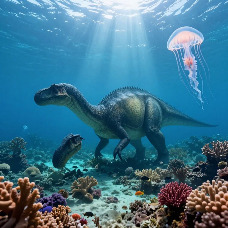 A captivating underwater realm reminiscent of James Gurney's imaginative landscapes showcases a tranquil coral reef abounding with vivid marine life, bathed in the enchanting glow of sunlight filtering through azure waves. From an unusual vantage point, it reveals the awe-inspiring sight of a colossal, gentle dinosaur lazily grazing on the seabed, its immense form juxtaposed against the delicate, translucent tendrils of jellyfish gracefully drifting nearby. This harmonious fusion of prehistoric creatures and contemporary oceanic splendor conveys a compelling emotional spectrum that stirs both admiration for nature's marvels and longing for bygone eras when these two worlds could coexist in serene unity.
