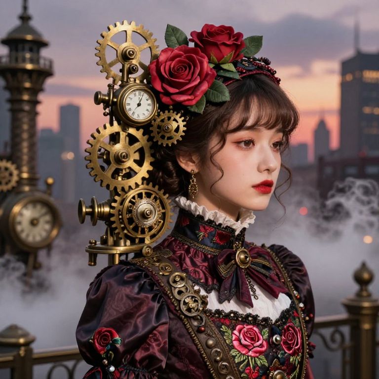 Rozen integrated into a vibrant steampunk world, adorned with rose motifs on intricate brass gears and clockwork machinery, wearing vintage Victorian attire with rose embroidery, cityscape in background shrouded in steam and dusk light, richly textured and atmospheric.