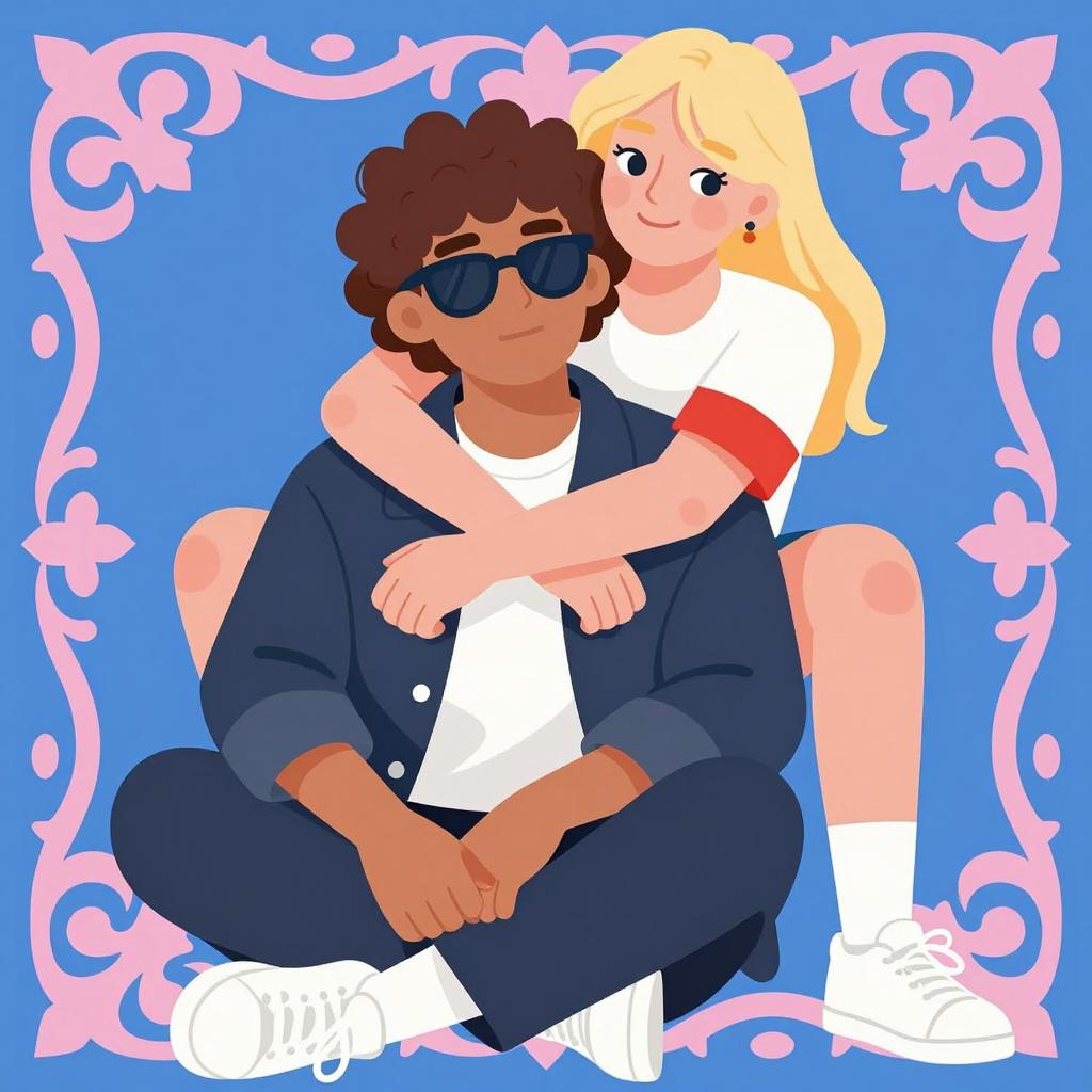 Two people in a colorful illustration. A curly-haired person with dark sunglasses, wearing a dark jacket and white shirt, sits with legs crossed. A blonde person with a red armband on a white shirt hugs them from behind. They sit against a blue and pink ornate background. The curly-haired person has a neutral expression, and the blonde person smiles. Both wear white socks and white sneakers. The curly-haired person holds a small white object in their left hand.