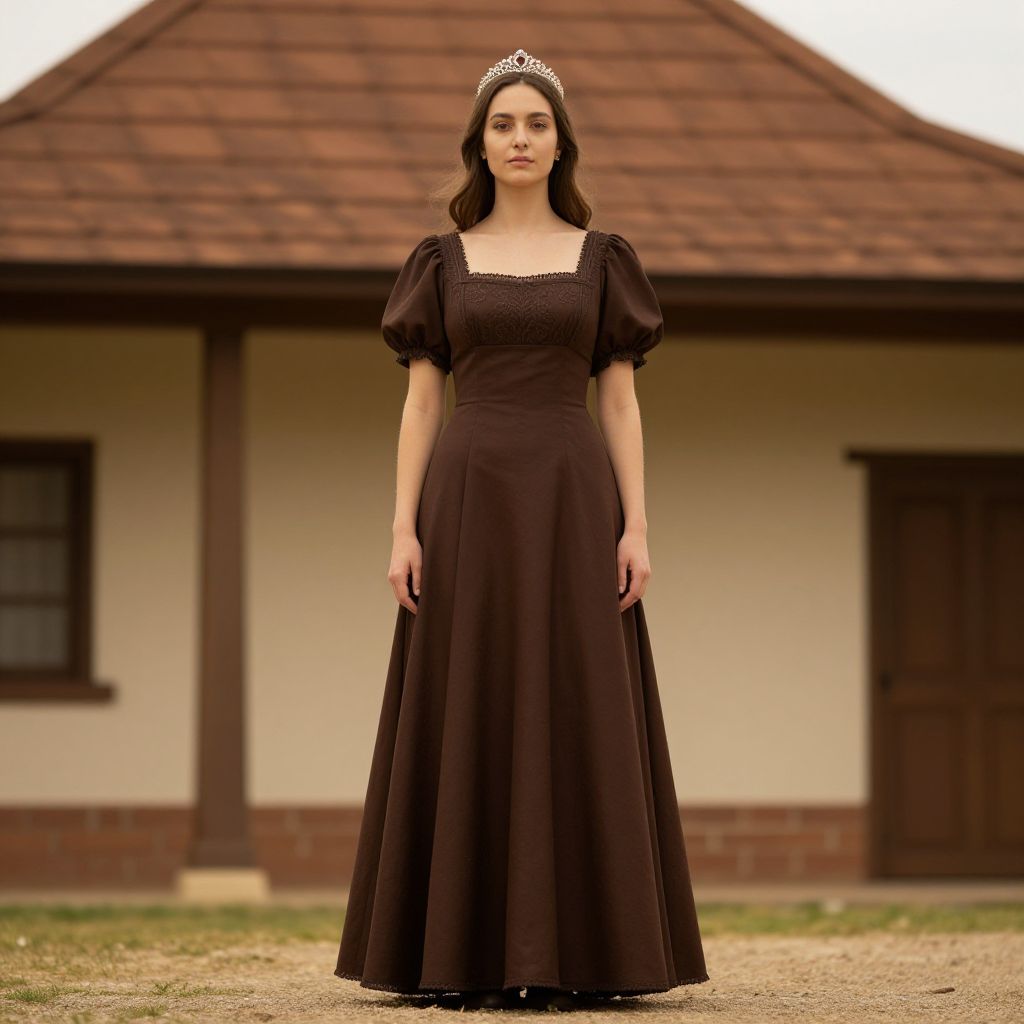 "Woman Dress Costume, woman in brown dress standing in front of a building with a brown roof"
