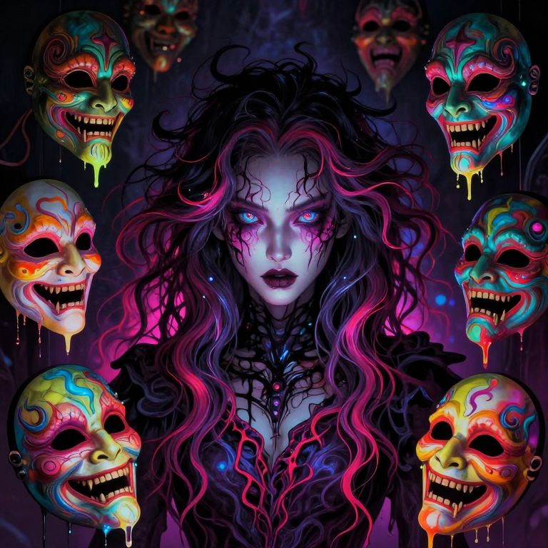A character with hair flowing like liquid shadows, her face illuminated by a pair of otherworldly glowing eyes, surrounding her are floating monstrous masks with distorted expressions, each mask dripping with neon colors, Style is Horror-fantasy realism with intricate details, vibrant color contrast, eerie yet enchanting, elaborate fine details