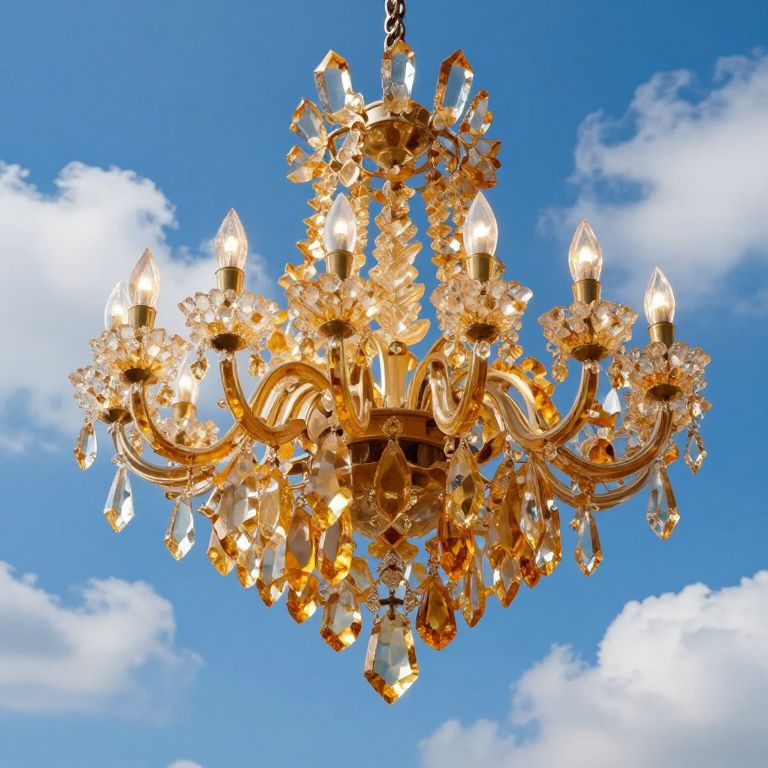A surreal 3D-rendered chandelier composed of cascading amber crystals, each resembling frozen moments from various epochs, hangs dramatically against a vibrant blue sky with fluffy clouds, evoking a dreamlike, otherworldly aesthetic.