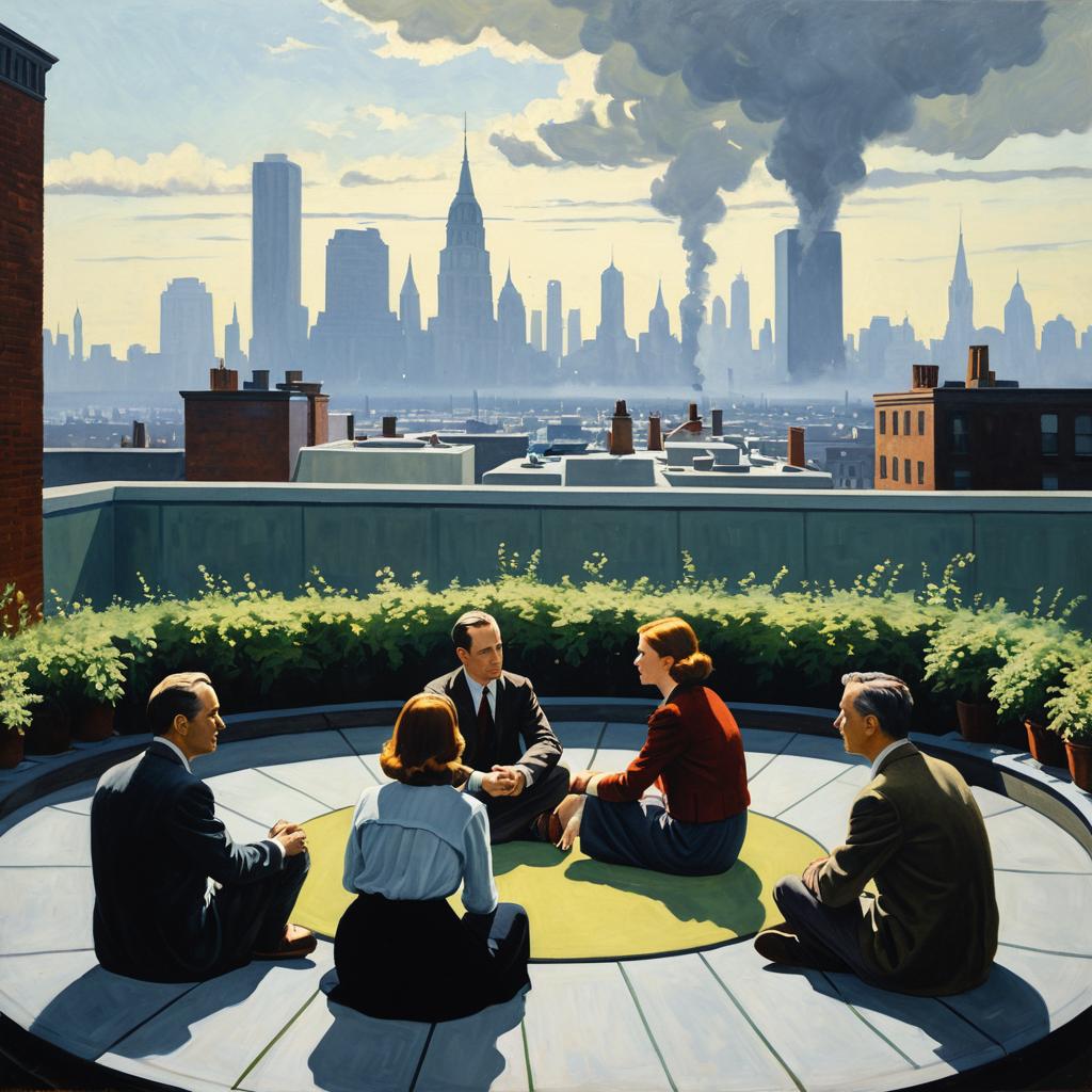 Edward Hopper people sitting on the ground in a city rooftop garden together, talking in a circle, oil on canvas, misty morning, canvas structure, colors, striking visuals, intricate paint details, in the background the sky and clouds, in the style of Mary Cassatt