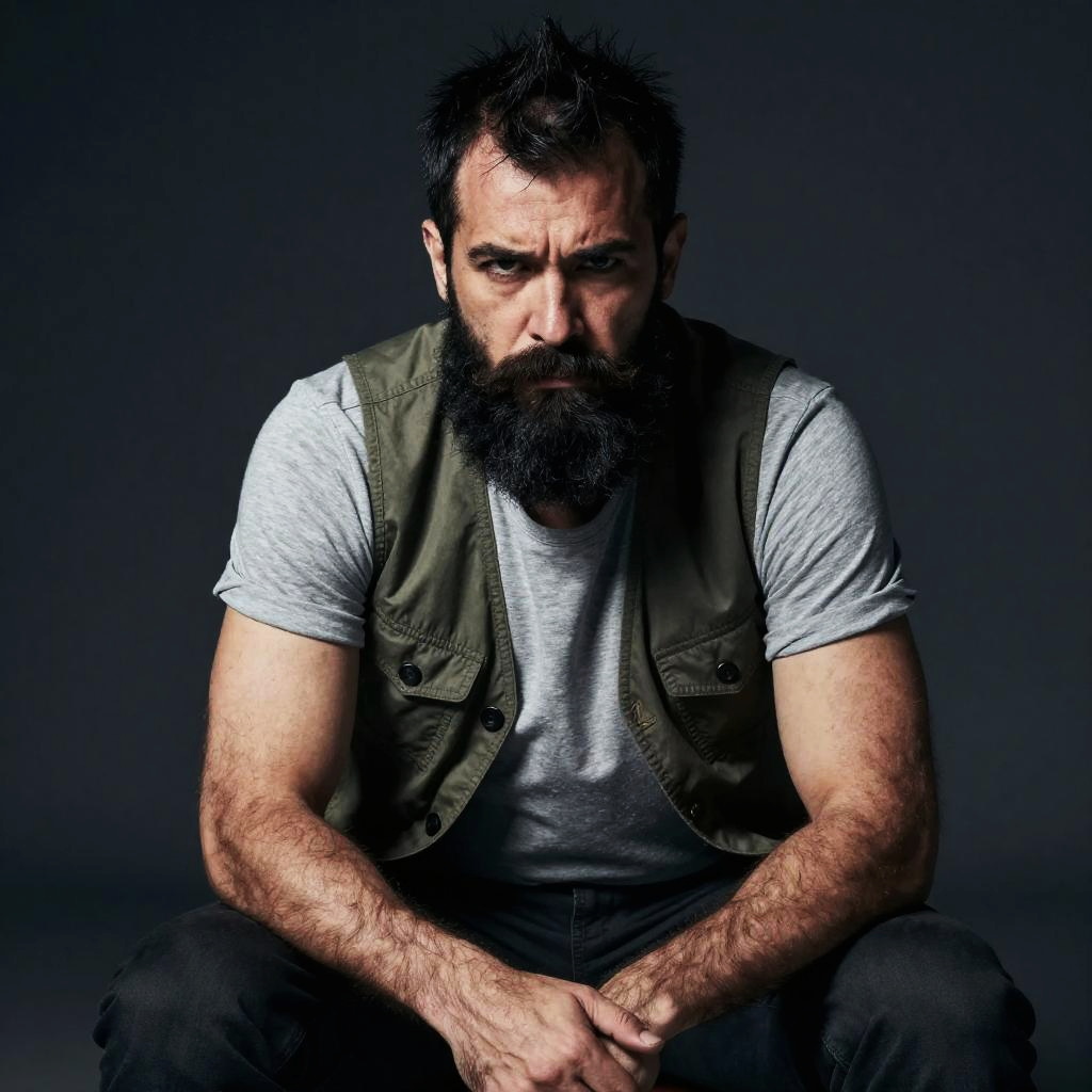 Editorial portrait of adult man with shaved head and thick black beard, wearing fitted dark green military jacket over a gray crewneck shirt, in urban street with graffiti-covered brick walls and overcast sky; direct gaze, neutral expression, even softbox lighting with gentle rim light, clean composition, high-resolution detail, soft shadows, subtle grain, balanced color, fine-art editorial mood, emphasis on shape, posture, and texture.