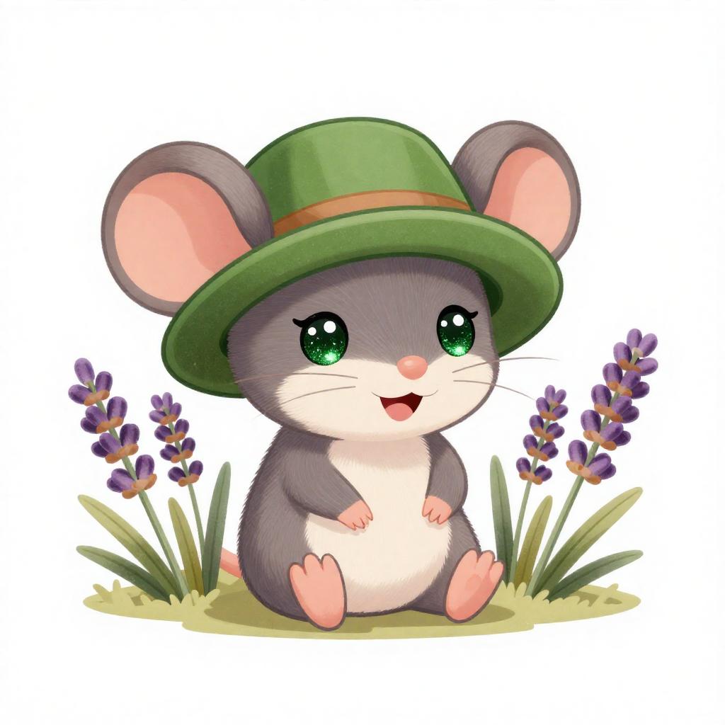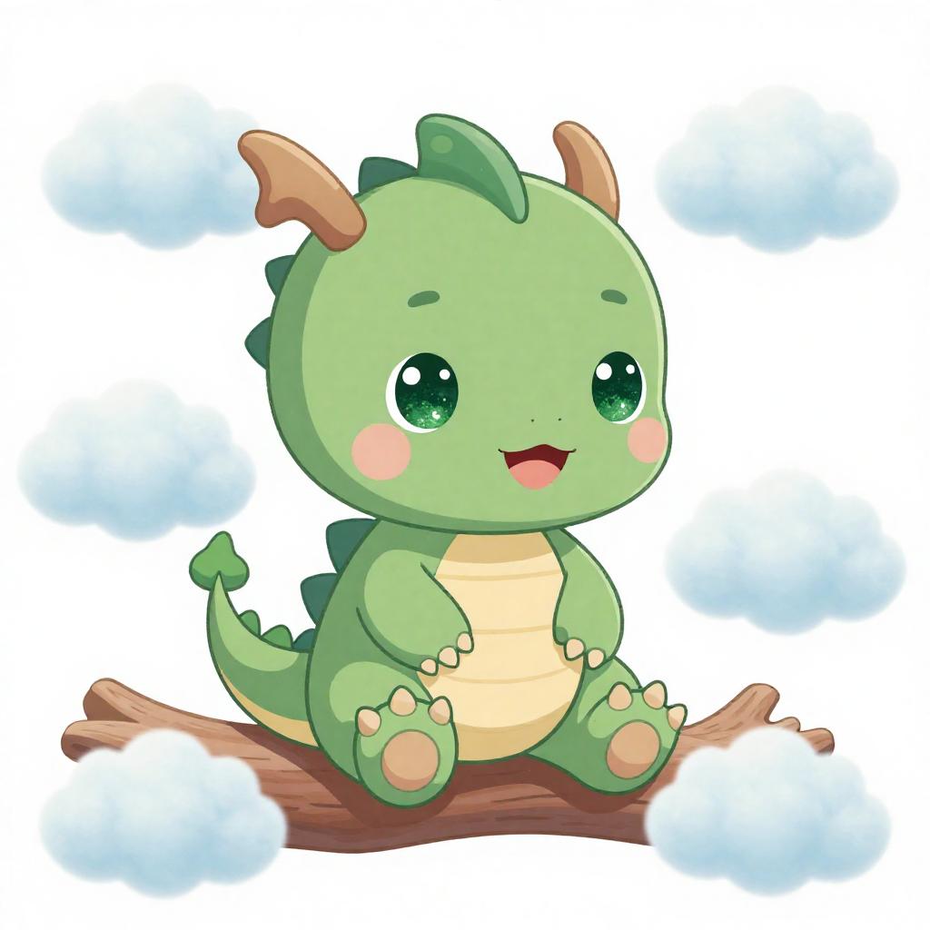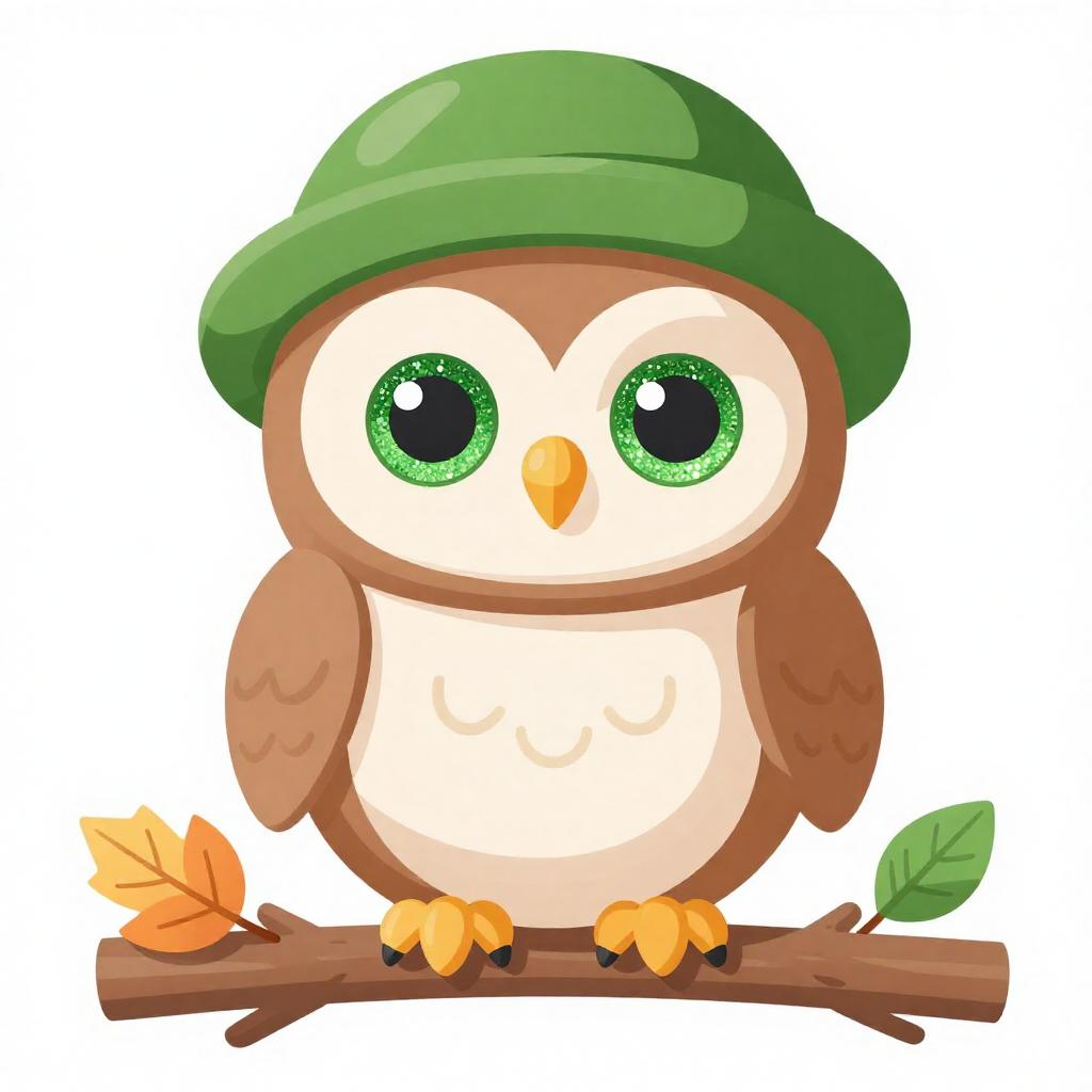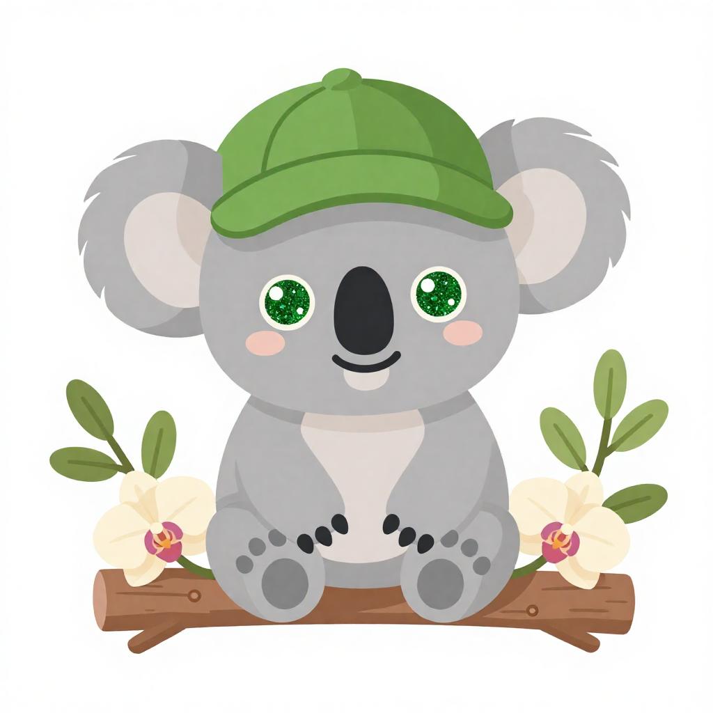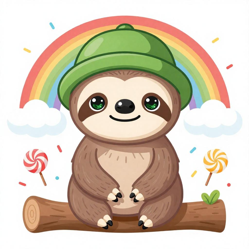 Illustration of a cute baby sloth with green glittery eyes wearing a green hat, sitting on a tree bough surrounded by tropical green leaves. The sloth has a smiling face and soft brown fur. The background is white, emphasizing the vibrant green foliage and the playful character of the sloth.